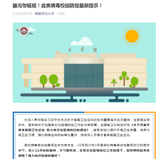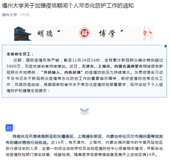泉州市向广大师生员工及家庭印发秋冬季学校新冠肺炎疫情防控和传染病预防工作提示。福建师范大学、福州大学等高校通过官方微信、校园网等平台向全体师生员工推送冬季疫情防控小贴士,根据国家和省市关于常态化疫情防控部署要求,同时针对秋冬季节空气干燥、昼夜温差大、疾病多发季节等特点,针对高校生活日常的宿舍居住、校园生活、前往图书馆、理发室、前往超市、商场等场所,以及就医就诊等日常生活环节进行防控提示。