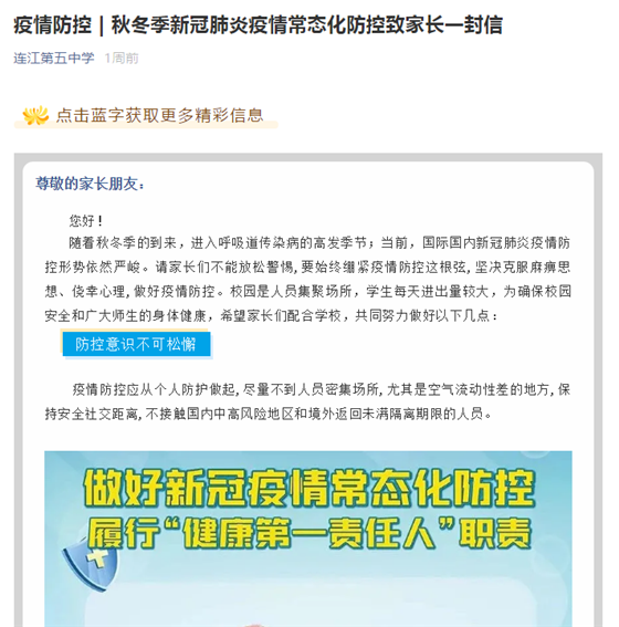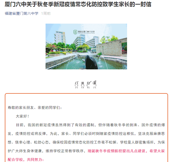 不少中小学则向家长发出秋冬季新冠疫情常态化防控的一封信,就冬季疫情防控提出建议,加强家校配合。