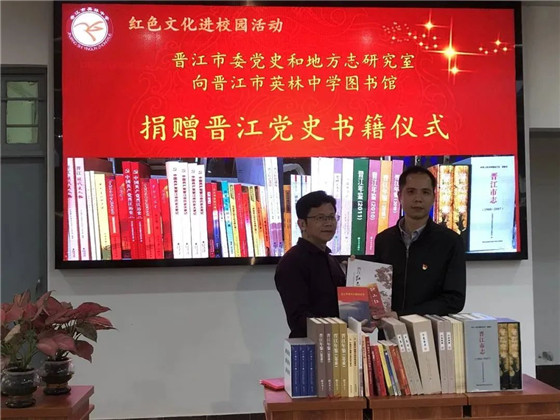 日前,晋江市委党史方志室向英林中学捐赠党史和地方志图书400多册,在学校图书馆开设党史和地方志专柜,供师生借阅。学校还邀请文史研究员陈金土为学生开展主题为《奋进百年奔跑少年》的党史和地方史专题公益讲座。