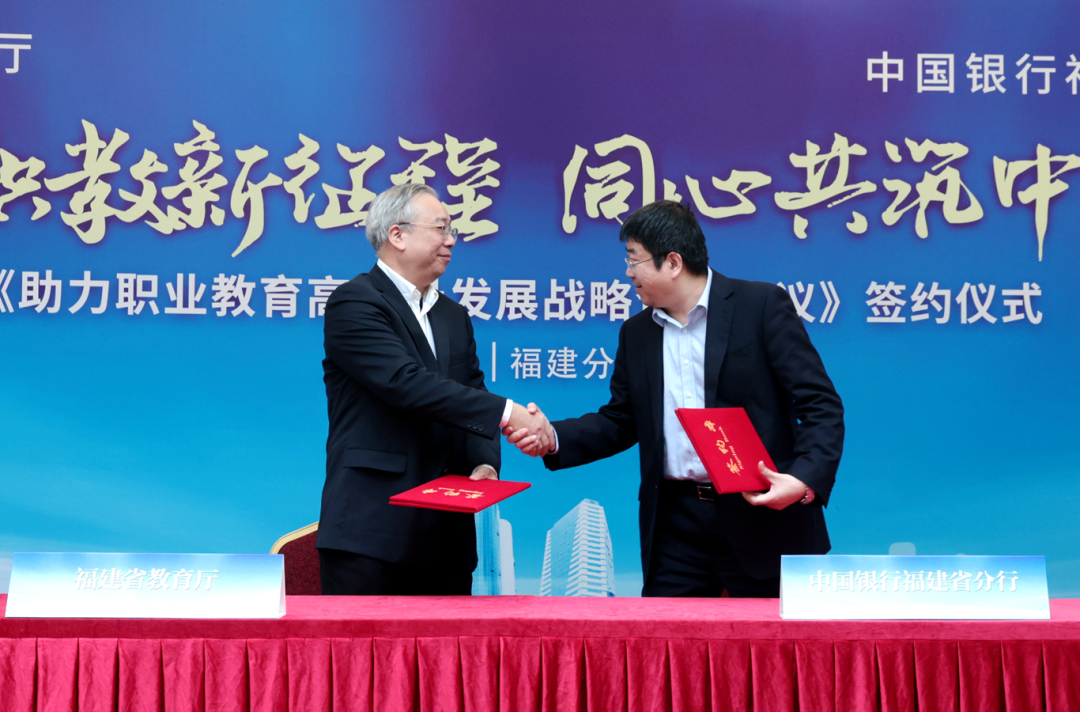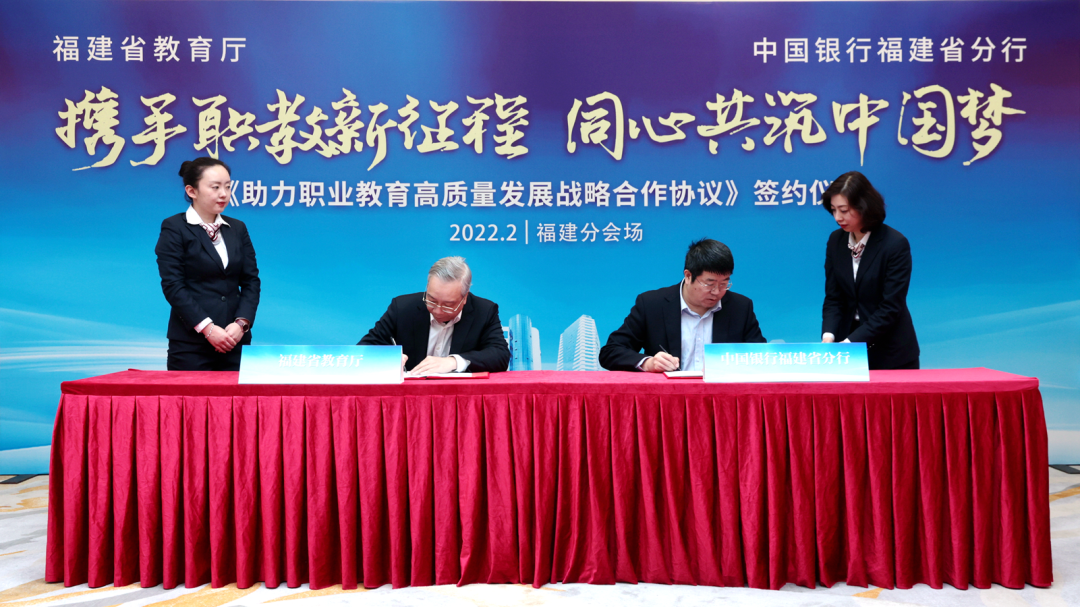 2月22日上午,教育部与中国银行在北京签署《助力职业教育事业高质量发展战略合作协议》。31个省(自治区、直辖市)教育主管部门及中国银行省级分行视频参加签约仪式。福建省教育厅与中国银行福建省分行参加签约仪式并签署合作协议。
