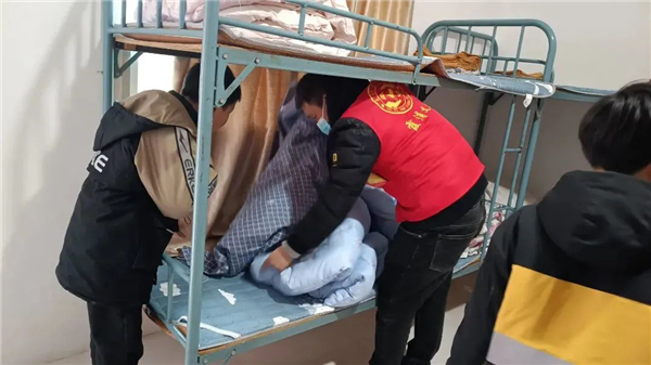 工作人员为将乐县光明中心校寄宿学生铺上崭新的棉被