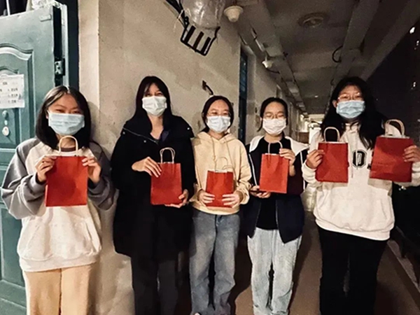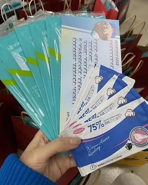 “暖心礼包”内有5个一次性医用口罩、5份医用消毒湿巾和1张学院写给每位学子的暖心卡片。