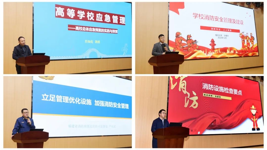 培训班采取现场教学和实操演练相结合的方式进行。邀请省消防救援总队专家作高校消防安全管理讲座,福州大学、福建农林大学保卫部门负责人作学校消防安全及应急管理经验分享。实操演练环节,邀请福州高新区消防大队为学员开展火灾疏散演练,并对灭火器、消防栓的使用进行实操演练,提升逃生避险、自救互救能力。