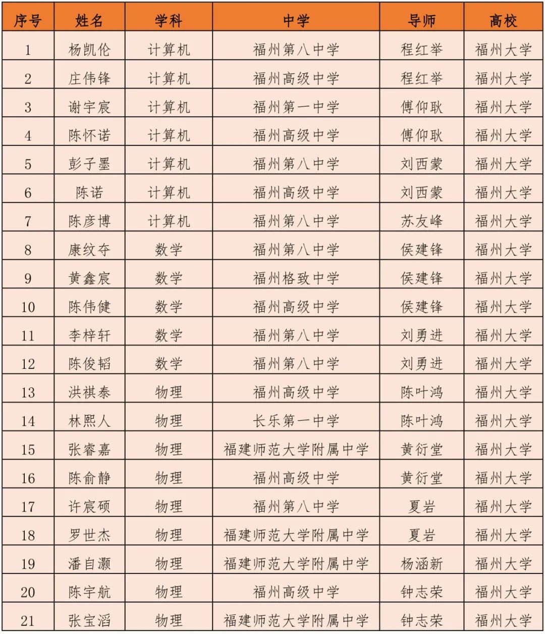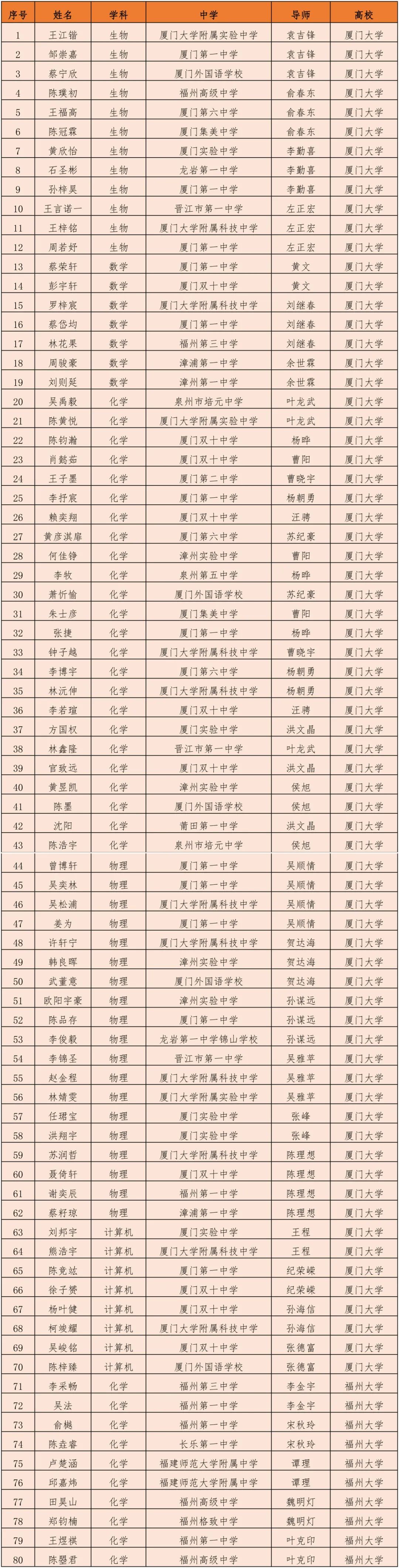 2024年全国中学生“英才计划”福建省学员名单