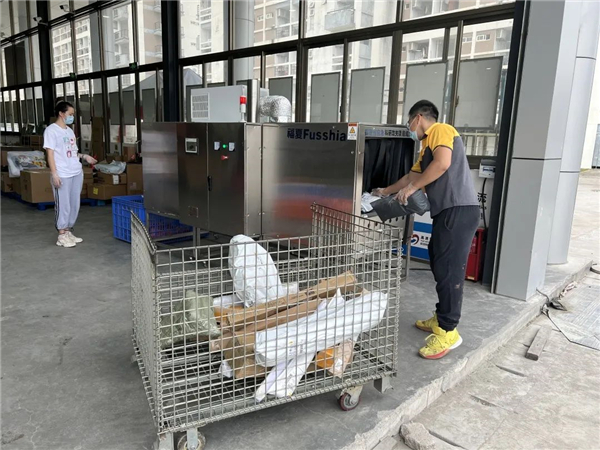 工作人员将进入校园的快递放入消杀机进行逐件消毒