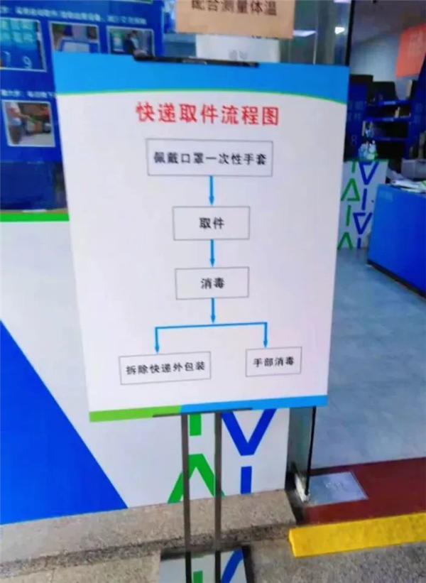 福建医科大学快速响应和排查顺丰快递路径,规范快递取件流程,在快递点门口粘贴流程图,设置体温检测并提供口罩、一次性手套等物资供学生领取快递使用。