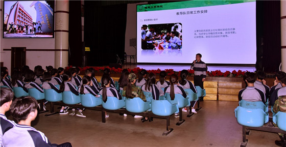 会上,播放了微视频《一声到一生到》、《这是人民海军》、《中国海军24小时》。该校官仁潇老师介绍学生教官队伍的发展情况及下阶段工作。副校长郑建芳作总结讲话,向队员们提出三点要求:一要牢记职责,不辱使命,提高责任意识、纪律意识和榜样意识;二要加强业务学习,了解岗位工作内容,提升团队战斗力和保障力;三要提升自身素质,包括自身形象、文明礼貌,在工作中做到文明执纪,努力成为一支“召之即来、来之能战,战之能胜”的工贸特色教导大队。