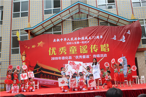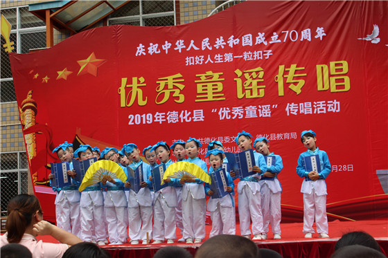 “剪窗花,剪个啥?剪出心中最美花;剪高山,剪大河,祖国山河都剪下;剪理想,剪希望,剪出一个大中华……”5月28日上午,朗朗上口、富含哲理的优秀童谣在德化县双鱼幼儿园大操场舞台上响亮唱响。由中共德化县委文明办、县教育局主办,双鱼幼儿园承办,龙浔镇南门社区协办的2019年优秀童谣传唱活动在此举行。