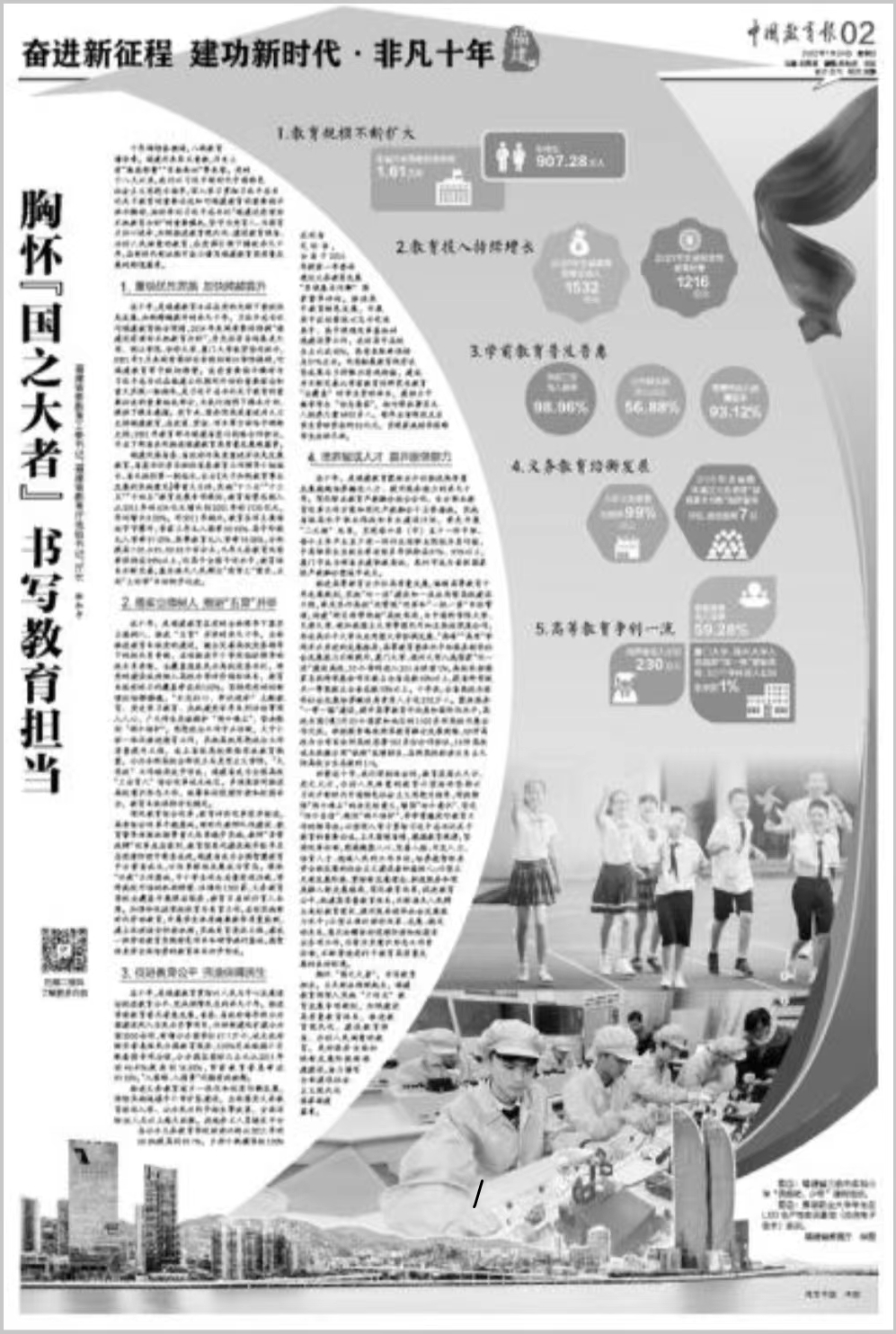 7月24日,中国教育报第二版“奋进新征程建功新时代·非凡十年·福建篇”整版刊发省委教育工委书记,省教育厅党组书记、厅长林和平署名文章《胸怀“国之大者”书写教育担当》及福建教育发展主要指标性数据。