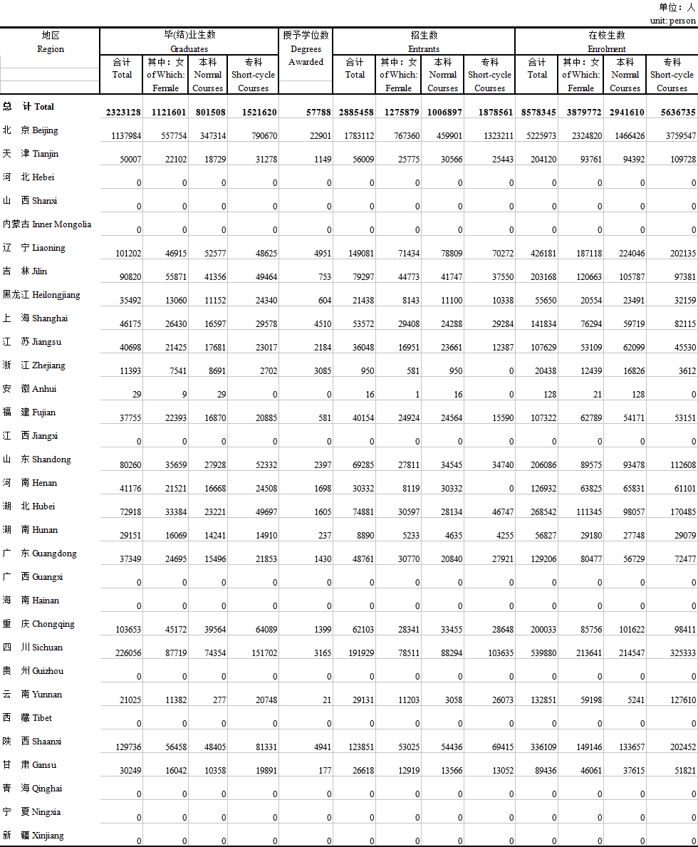 2019-2020学年初全国各地高等教育网络本科、专科生学生数